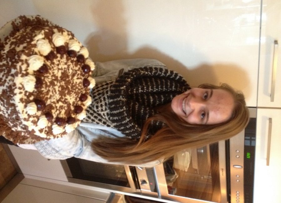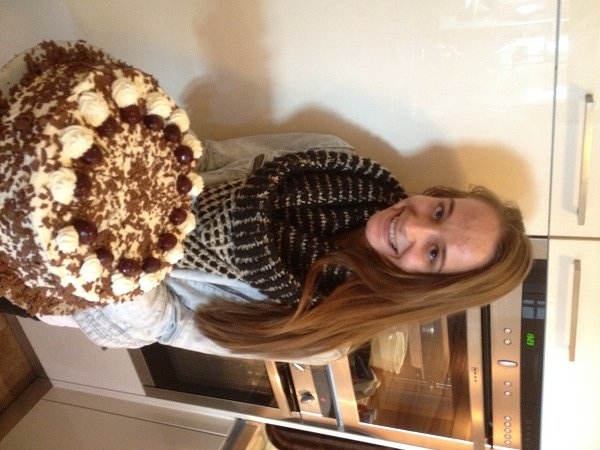 backte ihre 1. Schwarzwälder Kirschtorte als Geburtstagsgeschenk.