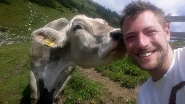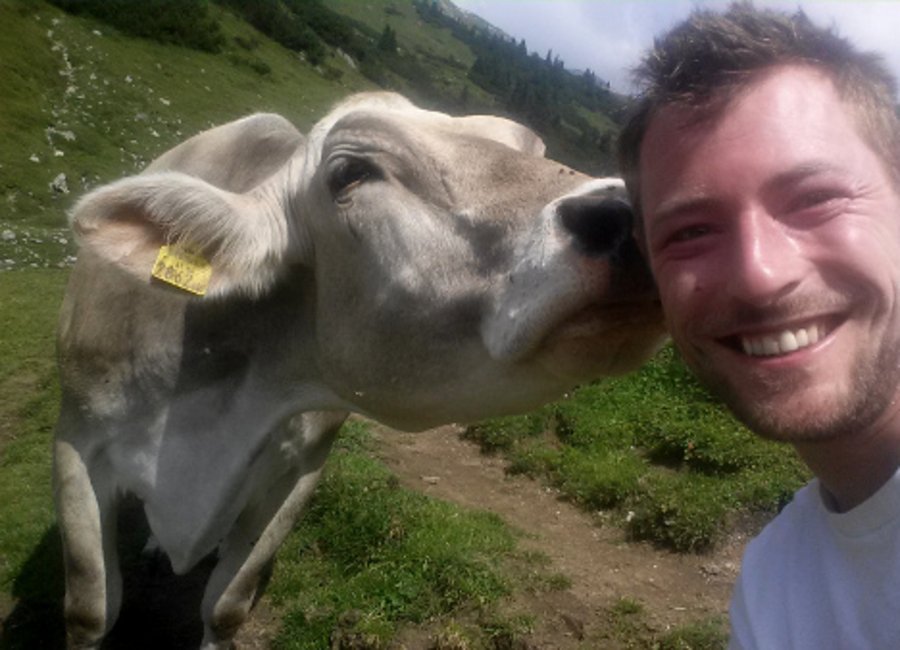 Obwohl empfohlen wird, dass Wanderer und Kühe auf den Weiden stets einen Sicherheitabstand einhalten sollten, konnte sich diese Kuh beim Anblick unseres netten Kellners Peer nicht zurückhalten! Die überraschende Begrüßung ist gut gegangen und beide sind wohlauf ;)