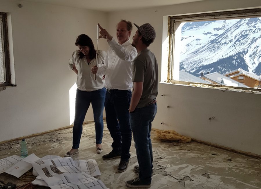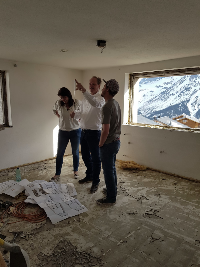 Noch stehen wir im alten Muxelhof und haben sichtlich Spaß an den Plänen. Dieser Teil wird morgen abgerissen und schon bald wieder neu aufgebaut. Bis zur Heuernte sollen die Grundmauern wieder stehen, so dass Stefan wieder unser saftiges, frisches Bergheu in den Muxelhof einfahren kann.