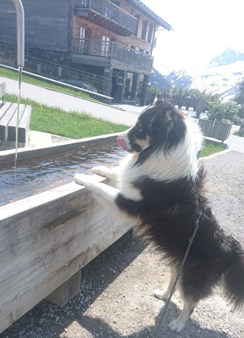 Der Quell-Brunnen steht wieder! Neben allen durstigen Wanderen kann sich auch Lux im klaren Nass erfrischen.
