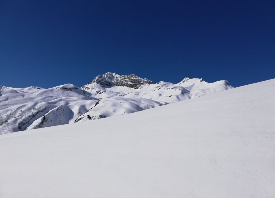 Die 2.542 m hohe Mohnenfluh glänzt im Kontrast von weißem Neuschnee und tiefblauem Himmel.