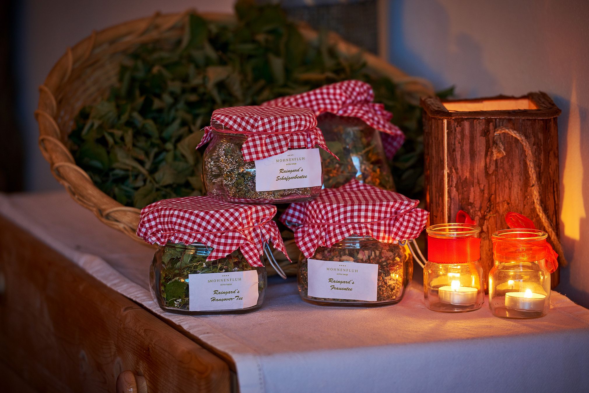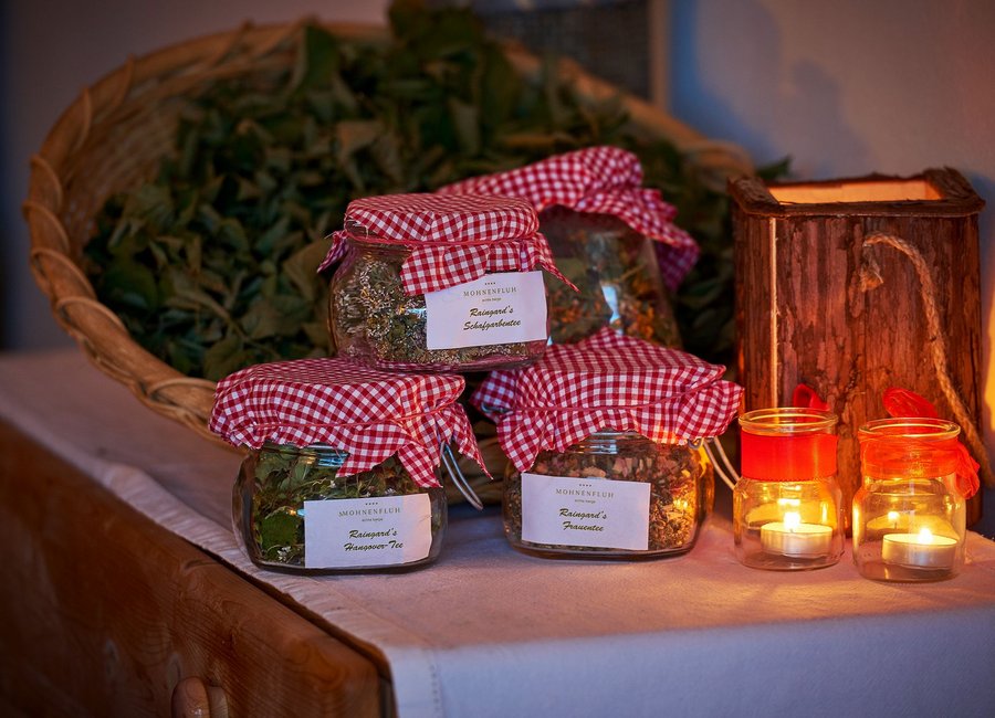 verschiedene Bergkräutertees, selbst geerntet und getrocknet, Hollundercognac, Arnikaschnaps und vieles mehr...