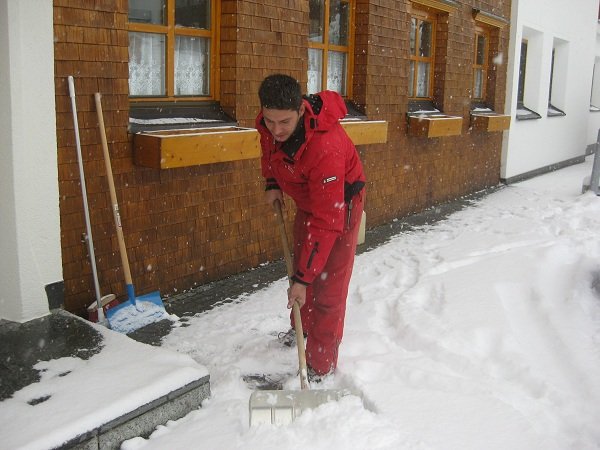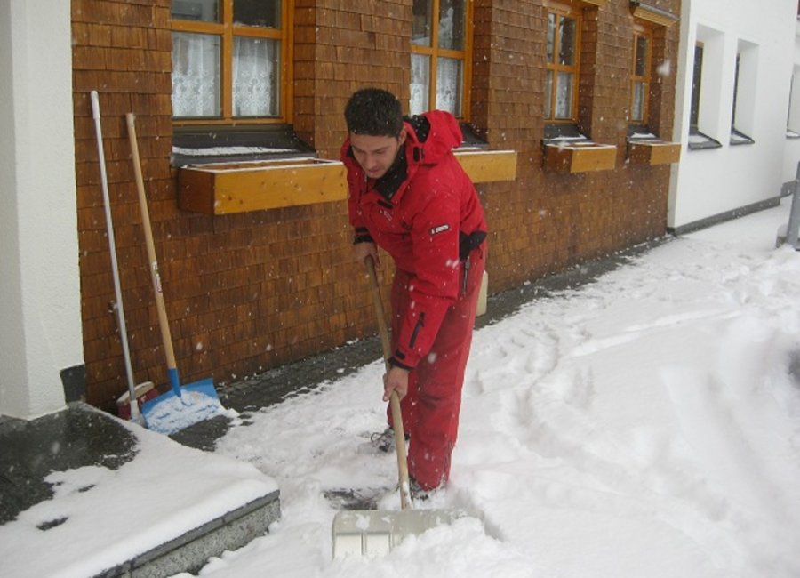 Hausmeister Davor hat bereits Schneeschaufel und Besen