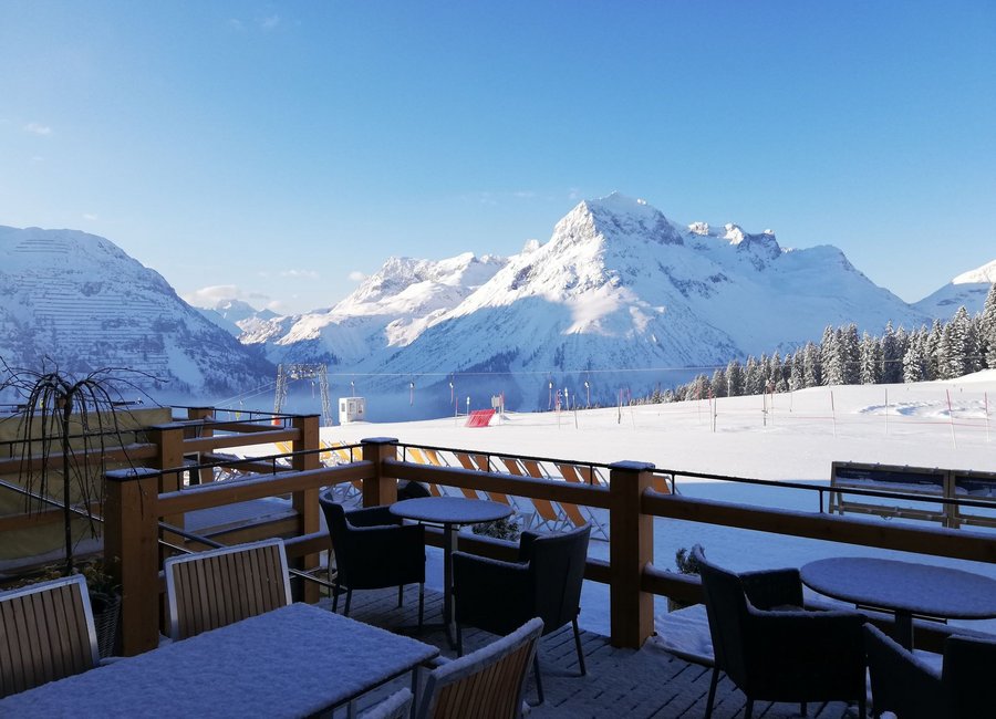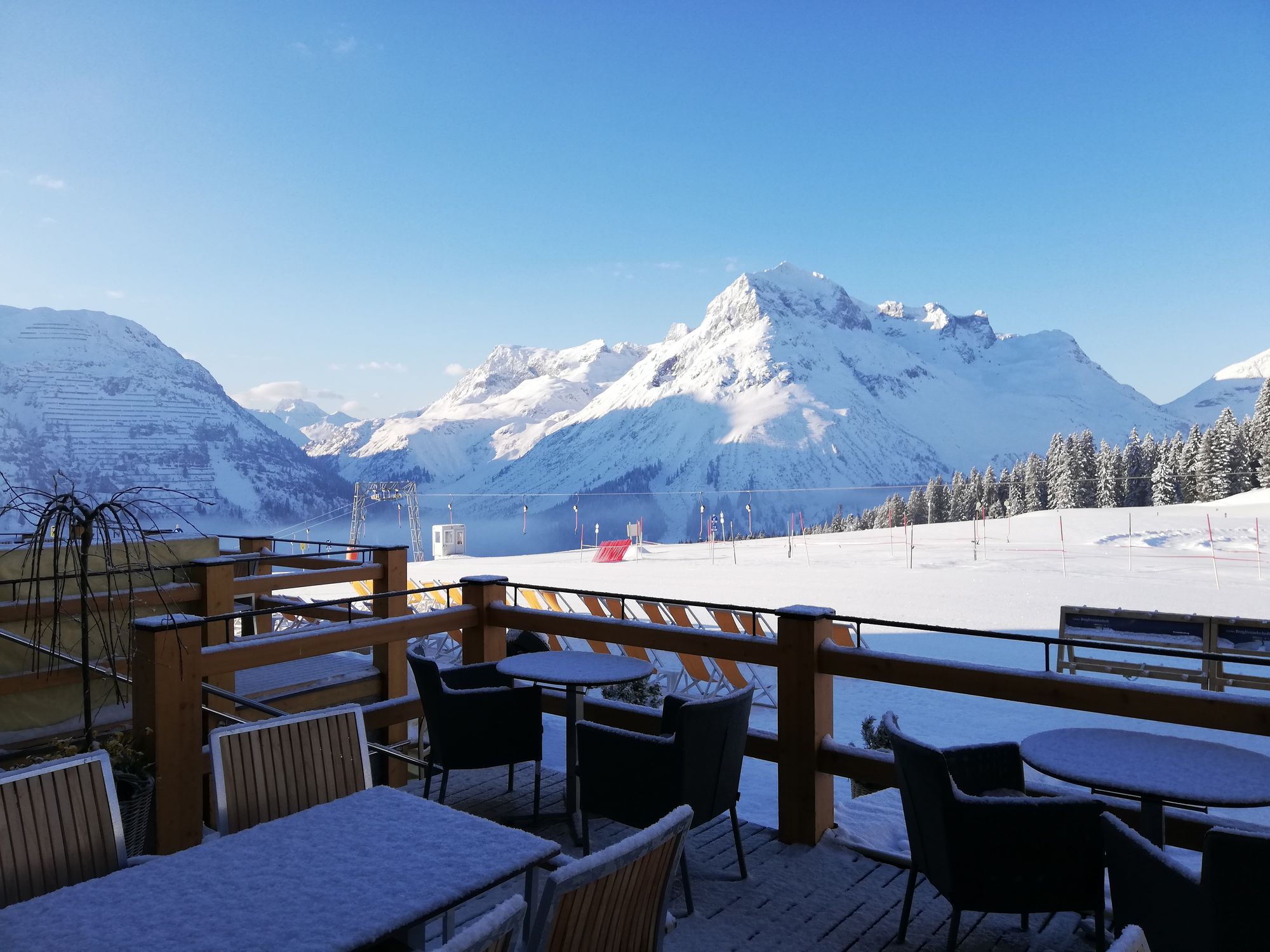 Reichlich Neuschnee von den vergangenen Tagen hüllt unsere Bergwelt einmal mehr winterlich ein. Die Morgensonne erstrahlt über dem Arlberg & trifft bereits in der Früh auf unsere Liegestühle.