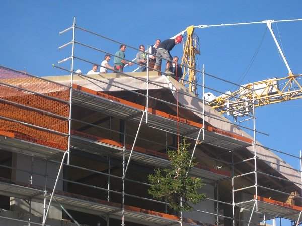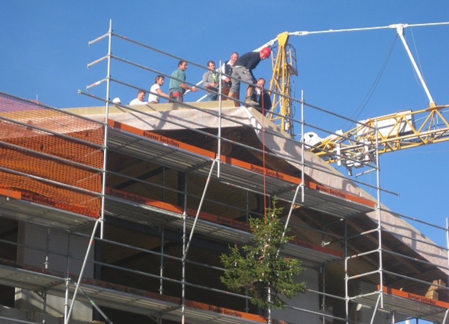 Zu der Firstfeier wurde wie üblich der Firstbaum aufgezogen und