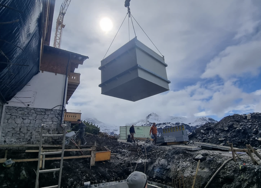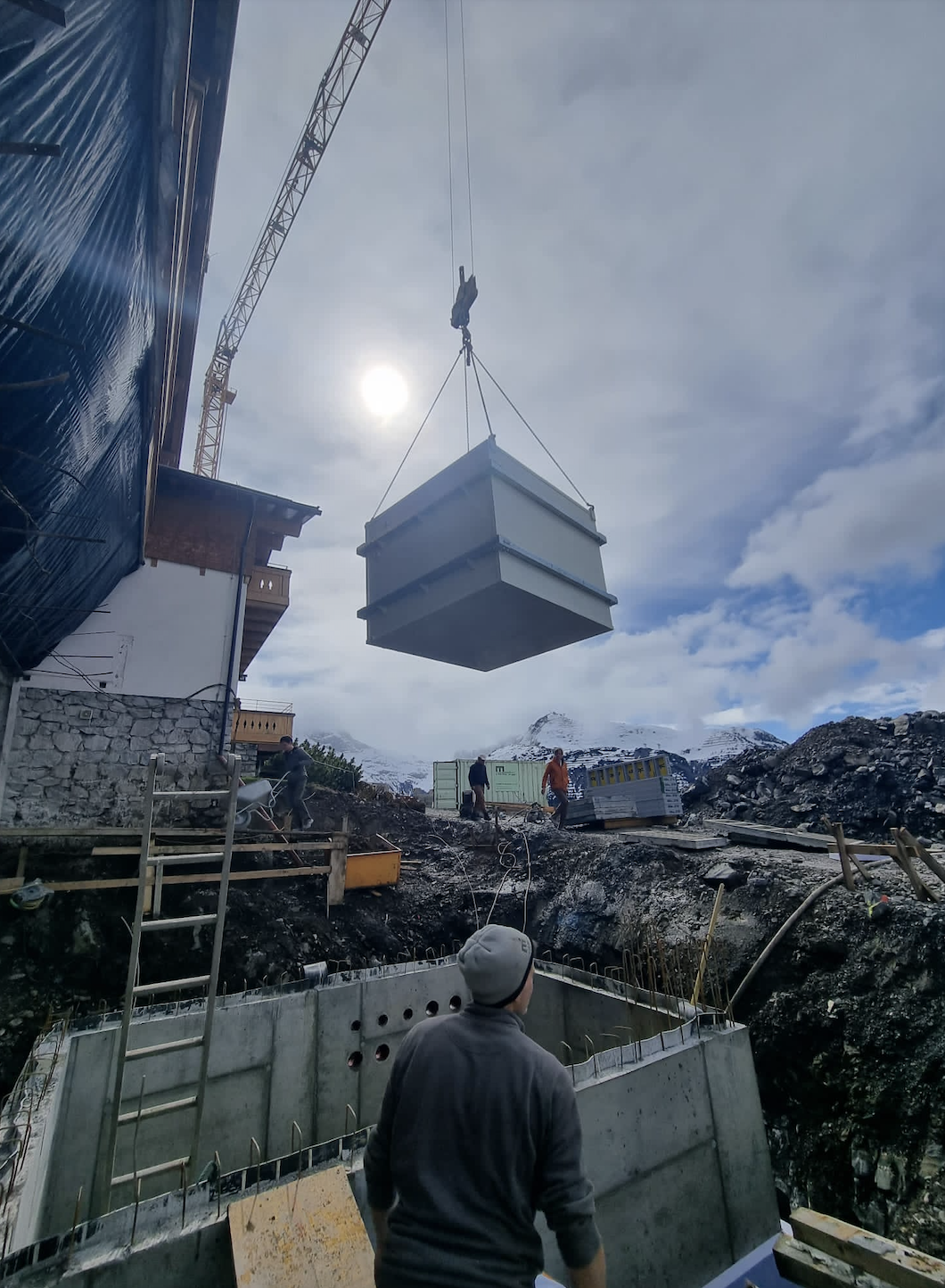 Auf der Baustelle geht es rasch voran. Heute wurde bereits das Ausgleichsbecken für den Pool eingesetzt!