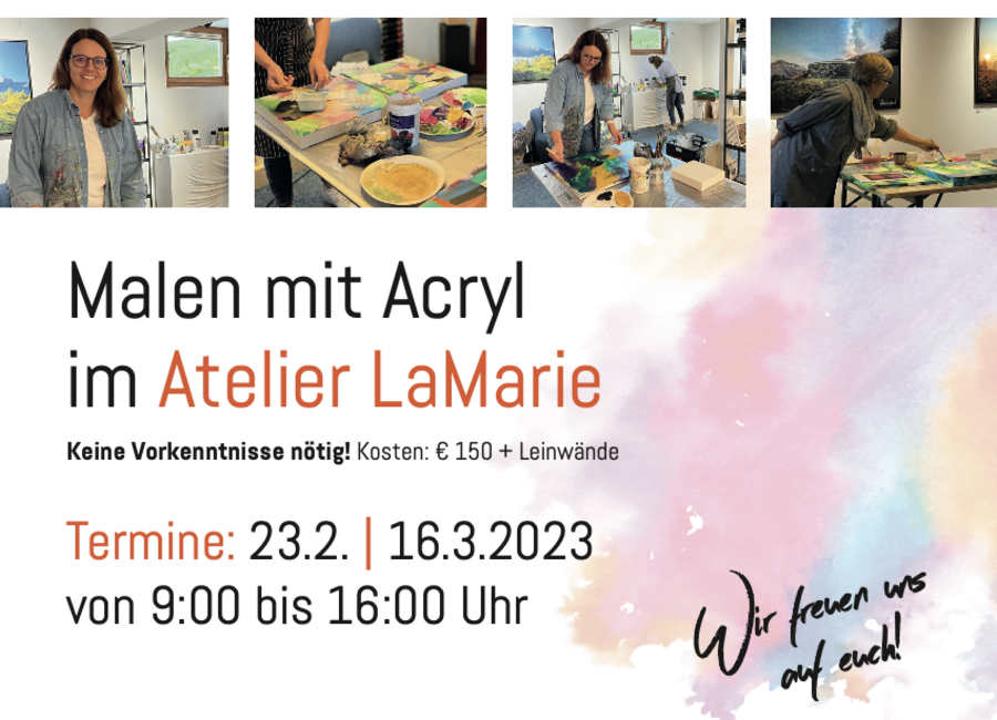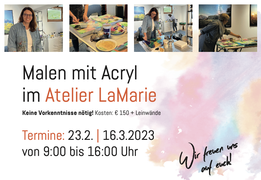 Auch im Winter finden im Atelier LaMarie wieder Malkurse mit Marion Koch statt! Am 23.2. und 16.3. widmen wir uns dem Thema des Acrylmales und freuen uns über Ihre Teilnahme!
