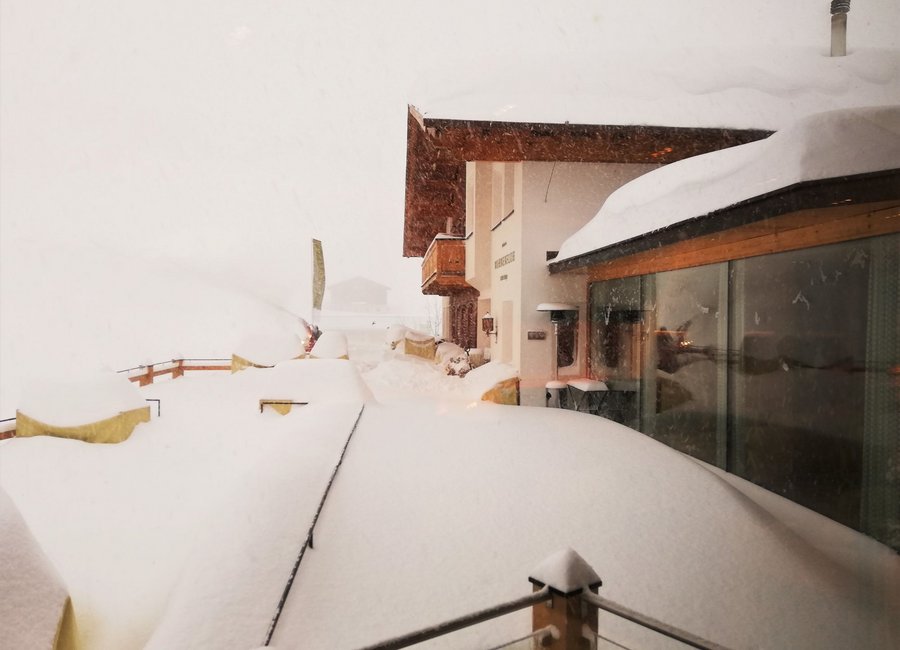 Nun hat uns Frau Holle erhört: die Oberlecher Bergwelt - inklusive unserer Terrasse - ist eingehüllt in einen Meter Pulverschnee :)